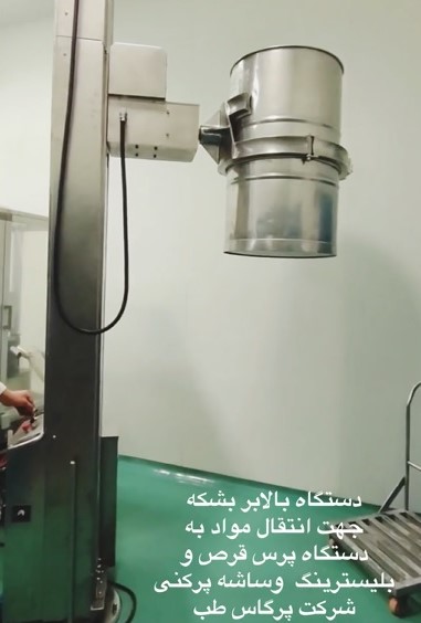 بشکه انتقال مواد از بخش ساخت به بخش بسته بندی انتقال داده میشود ، باید در موقعیت درب شارژ مواد دستگاه میکسر سرعت بالا (RMG)، بلندر دبل کن و بین بلندر و یا پرس قرص ویا ساشه پرکنی قرار گیرند. به این منظور باید از دستگاه بالابر بشکه استفاده می شود.قابلیت چرخش بشکه تا 180 درجه امکان پذیر میباشد